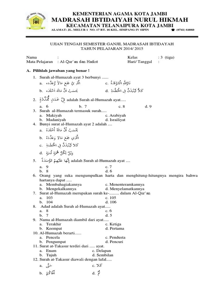 By hamdanifajar in types > creative . Play this game to review religious studies. Kumpulan rangkuman dan latihan soal kelas 3 awaliyah semester 1. Soal qur'an hadits kelas 3 mi. Kelompok kerja madrasah ibtidaiyah kecamatan jaken jl.